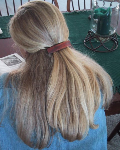 I've made a few wooden barrettes for my wife (she's wearing Koa wood in the photos) that I think are fairly gender-neutral. I think the half-clipped look is only slightly more feminine, but not by much. If my own hair ever gets long enough to pull back I will consider making a few "fatter" black-stained wood barrettes and see what happens. Reminds me I need to photograph a favorite that has knots and rough edges - very natural. Might even be more masculine. Stay tuned...