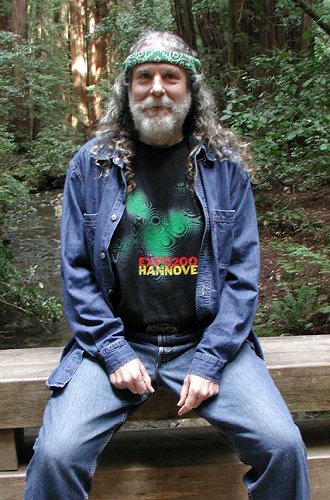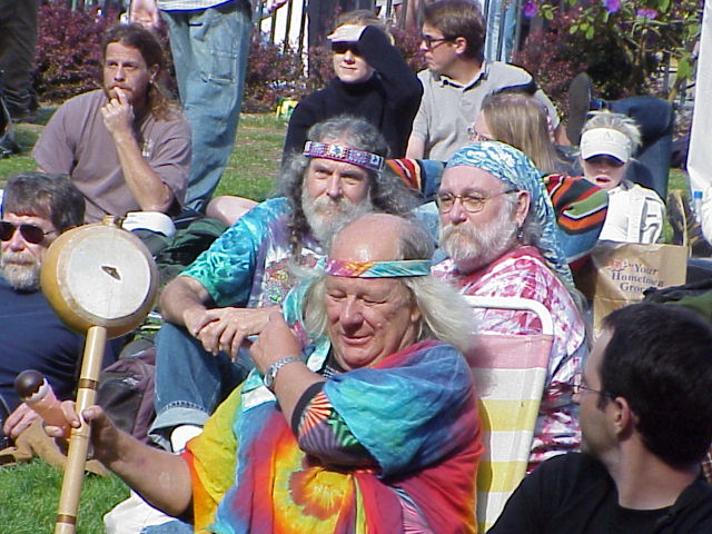 The longhair in front of me is a long-time fixture in the Haight, a guy named Wavy Gravy. Behind Wavy's other shoulder is a longhair I sort of know, I think his name is Dove. The three of us made a great trio, all in colorful shirts, all with colorful cloth wrapped around our graying manes! No wonder the photographer went for that shot! Everybody asks who the longhair is with his finger in his mouth, and I don't know. My partner Larry is the guy in sunglasses.