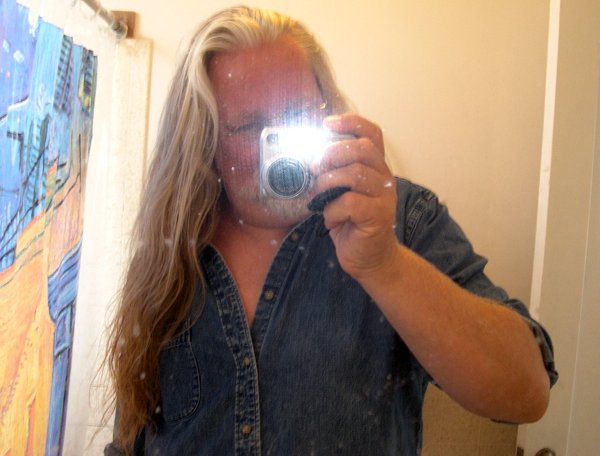 My bathroom mirror is not large enough to show more than my face and chest, so usually the sight is quite pleasant - a substantially bearded longhair with a dark mane reaching several inches below his nipples.