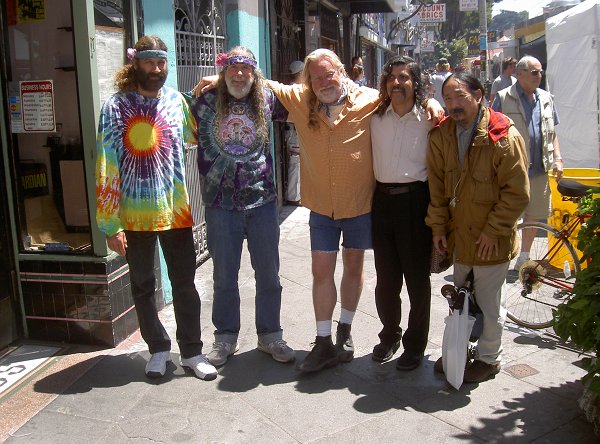 When going to hippie events, a guy of course should always consider picking flowers along the road for his hair! Flowers wilt quickly amidst your mane, so you want to pick them just before you arrive. The valerian flowers you see in my hair grow all over the place here in late spring in various shades of red, pink, and lavender, and these I saw along Ashbury Street a few blocks south of Haight were just the right color to go with my shirt. Hey, it's not groovy to not be color-coordinated!
