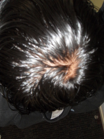 I don't see any hair loss in that picture. I've got a whirl on my head, combed properly you don't see it but looks like a hole in the hair. It's the hair growth direction, you can't change that.