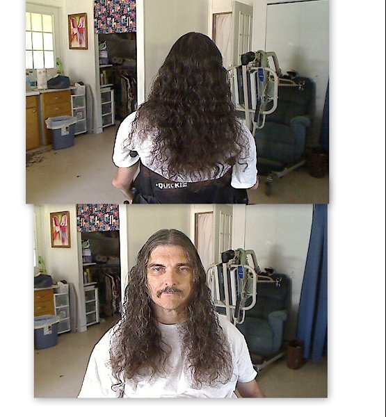 Your hair is gorgeous, Frank. It is really thick and full. It would be nice to be able to get past the point where it gets caught between your back and the wheelchair but that would require you going through quite a bit of pain to get there. For you, that may not be practical, and your hair looks super at its current length. Looking good.