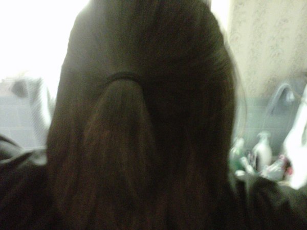 My hair is kind of the same type as yours: dark, straight, and thick. I'm still kind of in the awkward stage but lately I've been doing a half tail since I can't get a full on pony tail yet. I think the half tail looks really good and fairly distinctive and unusual with our hair type. I apologize for the grainy crappy picture. I will try to post a better one later