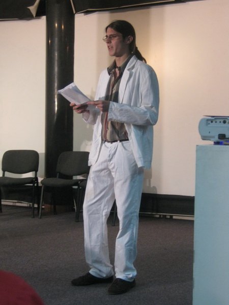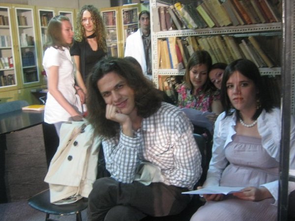 A manifestation for the Faculty Day was held in the municipal library on Monday, and several students were to read their works and perform two plays and a presentation. Here I am, sitting and waiting to be called to the stage. I read four poems.