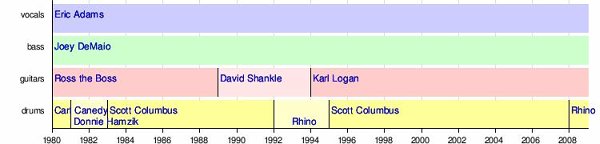 It's still Joey DeMaio on bass and Eric Adams on vox, with Karl Logan on guitar since 1994, and Scott Columbus back on drums since 1995. Here's a link to one of their more recent songs (set to scenes from "300"), to give you a taste of what they've been up to...