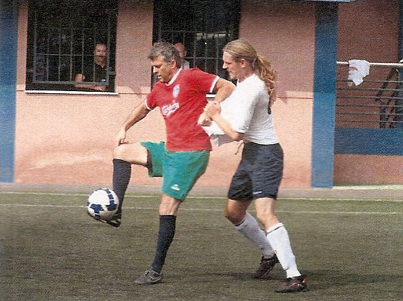 This photo taken during the 2009 Soccer 7's International Master's Tournament in Tenerife, shows me tussling with former Scotland International Darren Jackson, who earned 28 caps for his country and played for various top flight football clubs including Hiberian, Celtic, Newcastle and Hearts amongst others.