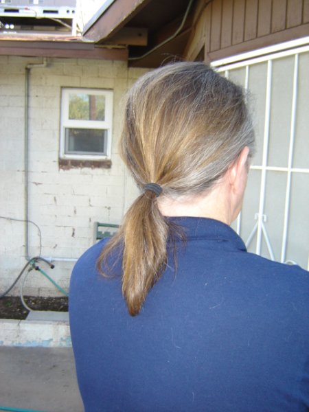 ...My tail at 4 months, down to shoulder blades, I can reach it tied or untied without stretching. Jeez, I have a lot of silver/white, Don't care if it goes plaid, it's all still here.