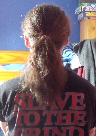 Hey there, random chick passing though. Your pony tail looks good, hope mine looks like that in the next year. But more importantly, where did you buy that Skid Row t-shirt? I want one!