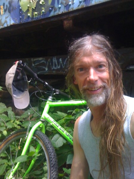 No worries about hair tangling as I had it tied up under that baseball cap you can see dangling from my handlebars.I just removed it for the photo op:)I certainly didn't want my hair getting caught up in branches and such while riding.I'm sure we'll meet again in September and look forward to seeing you again Scott:)Cheers