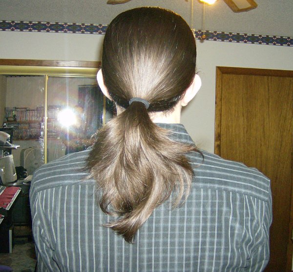 I believe this is the first pic I've ever seen of you (my apologies if you posted pics of yourself in the past, in which case I just don't remember). In any case, your ponytail looks hands-down TERRIFIC!!! No need to feel self-conscious about it whatsoever -- it's just a new look for you, so understandable it may take a little getting used to (I felt the same when I experienced my first ponytail back in the '90s).