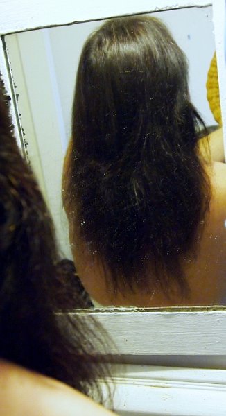 My hair is starting to reach mid back and it's a pretty cool feeling when I see the backside of my head...the journey has been long but well worth the time and patience it takes to decide to grow your hair long...To all you newbies out there, my advice is to just be patient and the rest will come...Here is a pic of the backside...It's a little frizzy because I did not condition it today because I'm about to do a henna treatment...Forgive the dusty mirror, forgot to wipe it down before taking the picture...