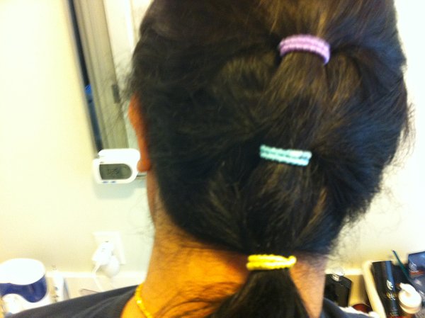 I think this look is kind of cool because it gives an instant French braid like look because of the sectioning of hair, and adding a pony tie to each section, instead of braiding it. I'm not like my sister who can French braid her own hair. I like this style because it's not the plain usual pony tail. Sorry if the pic is kind of blurry. I find it challenging to take a back shot of my head using only my iphone. I don't know what this style is called, but I'll call it "Tie, tie, tie, that pony!" hehehe I hope you guys are enjoying your day!