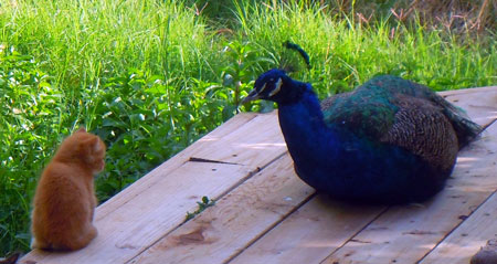 I have a peacock (named Mozart) who thinks he is a cat....plays with kittens, even lets them crawl over his back !!