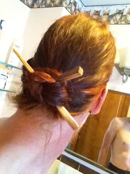 Hey, hope you all are enjoying a nice weekend like I am.Certainly great weather today.So today I'm posting another couple pics of my hair in a simple bun but with a new set of hair sticks I recently received.These are more like wooden chopsticks as compared to that plastic one I used in the last update.Nothing too fancy here as I haven't made any complicated braids like rowie has been showing recently.Anyway enough of me and onto the pics:)Cheers