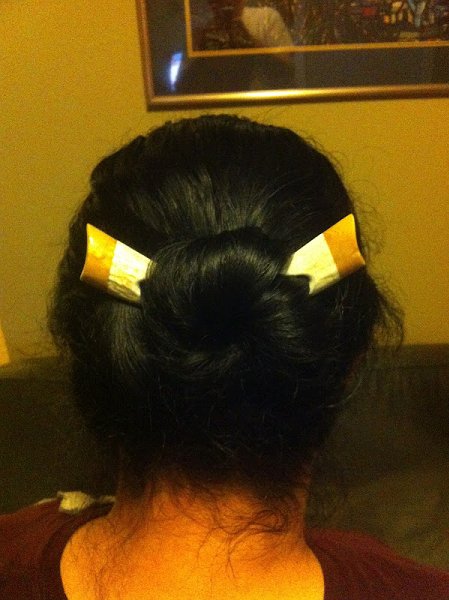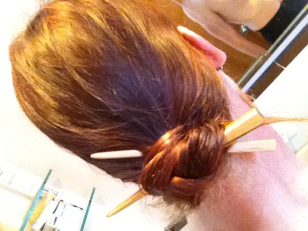 Mârk, you definitely are in the right path! The combination of colors of the sticks again go really well with your hair. It's nice that it looks like you did a nice tight bun. Did it hold well?