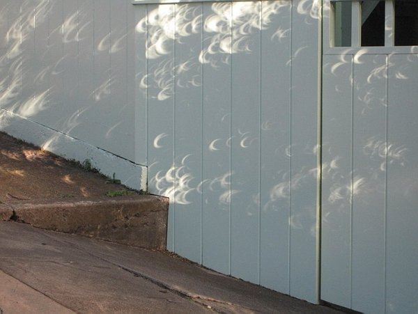 We got these crescent shaped dapples under our tree. They were more awesome than they look in the picture because it was windy and the tree creating them was blowing around a lot. The dapples were dancing all over the wall, the sidewalk, and our neighbor's house. Their movement looked a lot like prairie grass looks when it blows in the wind.