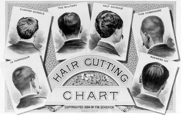 I came across this chart from 1884 (as I said before, the idea that short hair only became popular during WWI is a myth). I guess those were the basic choices (long hair was around but was rare and slightly eccentric). How depressing! How could any guy have his hair mutilated like that and think it looked good?!