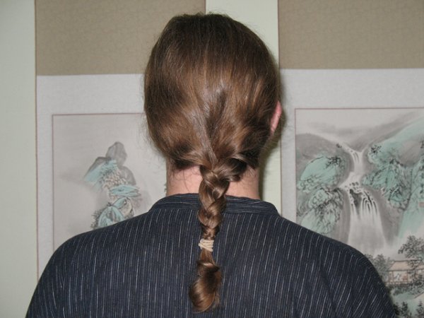 So yesterday, my wife braided my hair for me :o ! Not sure if it was done right (looks a bit short 'n off~)... I had to do it on her first, rather poorly, to show her how to do it :p . My hair is still a little too short to fully hold a braid, but it was still pretty cool none-the-less :) ...