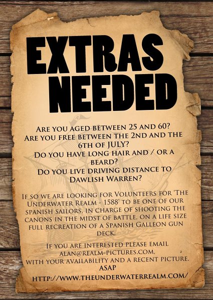 Realm Pictures are looking for volunteers for their upcoming film 'The Underwater Realm - 1588'. It is an exciting opportunity to come and be one of our spanish sailors, in charge of shooting the canons in the midst of battle, on a life size full recreation of a Spanish Galleon gun deck. We are shooting it using the Red Epic camera system (the same that is being used on the Hobbit) and we are looking for local people willing to get stuck in and throw themselves around our ship set.