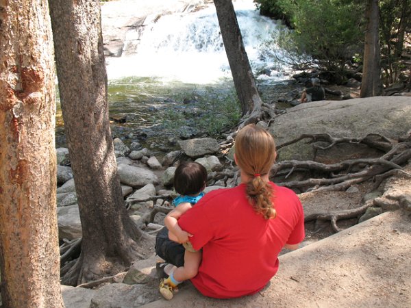 Photo - now I know this isn't San Francisco (don't get to travel much) but I'm cooling it off just the same :D . Here I'm enjoying with my little daughter the lower-side of cool Copeland Falls, a third of a mile in from the Wild Basin Trailhead inside Rocky Mountain National Park, south of Estes.