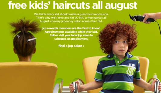 I don't like the fact that this scheme by JC Penny implies that if your child is long haired when he starts school next month he will not make a good impression.What on earth is wrong with that boy with the curly locks in that ad that is so horrible?They had a video clip on their web site showing a boy shaved bald after his free haircut!I defy anyone to say that butchery looked good on that kid.