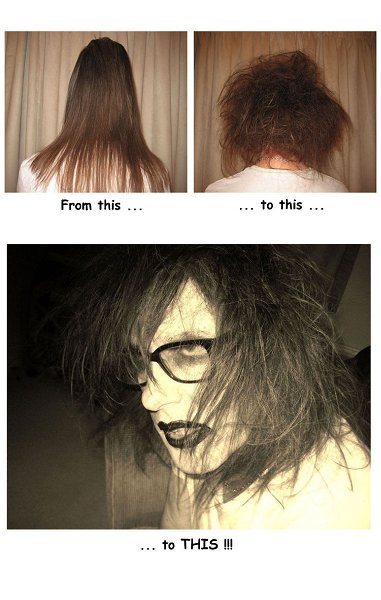 That is a total transformation into sheer terror! The hairstyle from hell. Have you seriously thought about applying for casual work as a Zombie film extra?