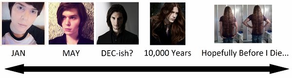 I totally understand the hurry and impatience of new guys growing out their hair the first time and want it long "yesterday". Your medley of photos illustrates the psychology of how many feel when growing hair that seems to take forever to get longer. I found the first 18 months the hardest but with every passing year it got easier. Your gonna have to be patient and enjoy the trip along the way. Just enjoy the journey, the different stages of growth both in hair and mind, and one day before you know it you will have reached your destination. After the goal is reached the journey will continue in other ways in subtle changes in hair colour and texture which only ends in death of the body.