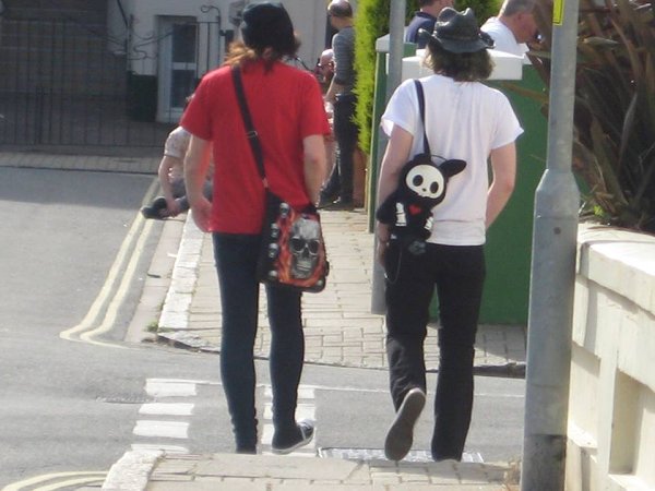 Me walking down the road with a mate later that day (I'm in the red T-shirt). Yes, my friends tend to have long hair too!