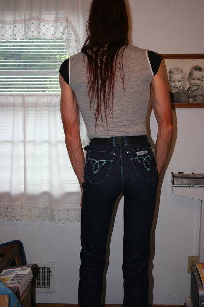 Wonderful hair on broad shoulders and a trim lower body frame. Shows exceptional determination to maintain long hair on a lean machine. It's gut determination to keep the fat off. Just shows long hair so much better. Fitting those sleek jeans with long hair pouring down helps me try to achieve the same thing.