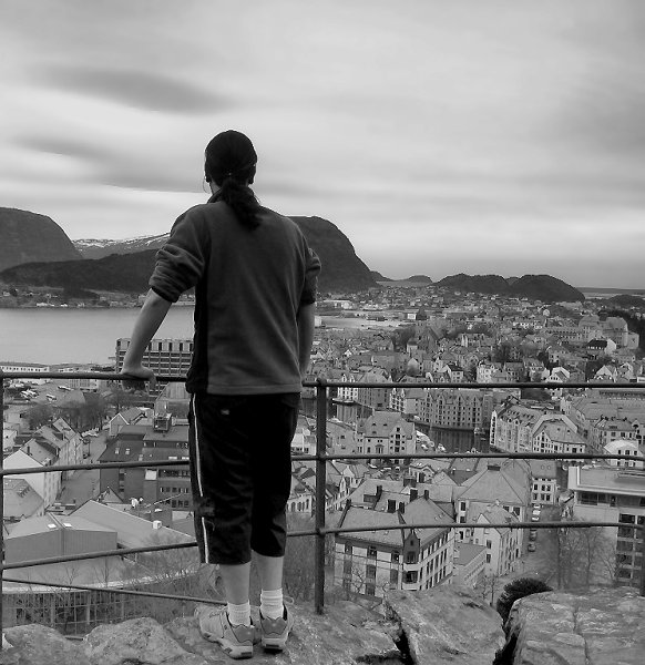 Me at the top of the Aksla panoramic viewpoint, in the city of Ã…lesund in coastal west Norway, taken sometime in 2006 or so.
