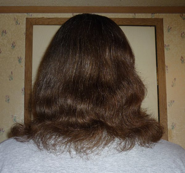 I should have taken a pic last night. It seemed like my hair looked more like it had a V shape in the back. Guess I was wrong! My crazy hair has a mind of its own! This is my hair after 3 days without washing. I guess it's finally becoming all one length. Not sure if this helps, but oh well.