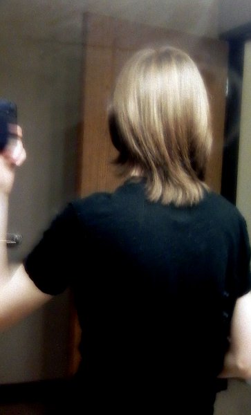 This is my progress so far; My apologies for the quality of the pictures, our dorm's bathroom mirrors are all I could use for the pictures.