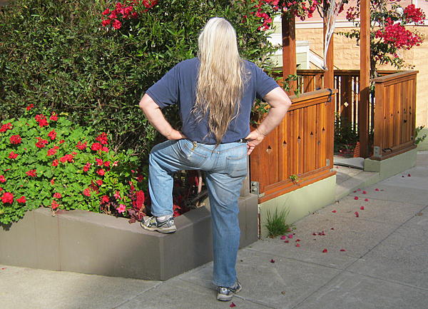 That pic was taken in front of a house and yard that neither Bill, Larry, no myself knew the occupants inside -- it was on our walk back up the hill to B & L's house after we met for lunch on Castro St., Bill suggesting that yard because of the bright flowers that would be in the photo. So you can think of it as a "virtual floral bouquet" if you want, from us on the West Coast to you on the East! (Of course the "bouquet" in this case also includes some long hair tossed in - LOL)...