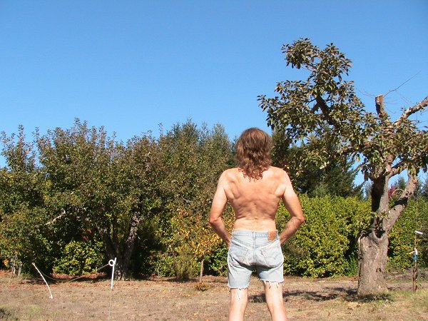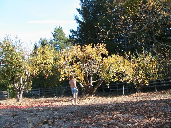 Mid November late afternoon. The sunset filters through the golden brown tree leaves to create an orange background glow. I'm modelling another pair of cut-off jeans.