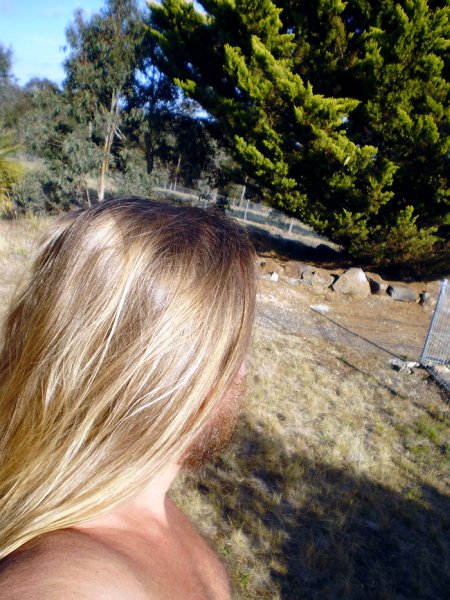 Hi 'Spaf' - thanks heaps - yes I've been living at the beach - which is why my hair may appear lighter than usual due to the salt-water & sun: ( but I always wear a hat to protect ) - my lightness of colour: ( in this shot ) is simply the angle of the late afternoon sun, hitting the hair, at just the right angle, to eliminate red & brown ... ( in the picture provided ) my hair appears brown: ( in this shot my hair was 15% still damp from a winter wash, the temp. was cold, taken inside, at night, under a 1 x 'eco-friendly' low-wattage fluorescent bulb ) & at other times such as in previous pics. posted here, I appear light red or strawberry blond - again, I emphasis, I do not colour, highlight, straighten or curl my hair ... It simply does its own thing & I let it ... yes the weather is 'nutty' & yes = I WILL have a swim for you ... take care & cheers CEM. :O)