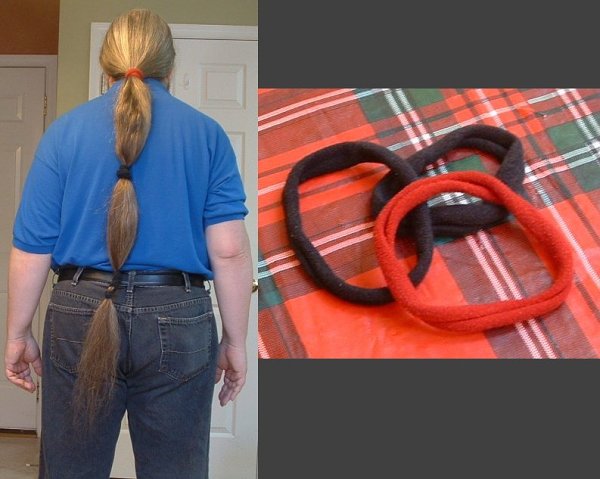 These pics show how I'm wearing it for my new job. First I do a rough segmented tail with the narrower ties. This makes it easier to work with, and I've found it stays in place better. Then I coil it up and wrap it with another tie into a bundle at the base of my head.