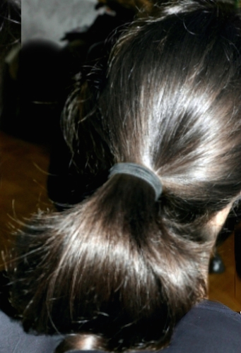 Figured I'd add a picture of my ponytail since that is how I usually wear it. It is surprisingly hard to take a good picture of your own hair. This is the best one I managed, not the best angle, but it will do.