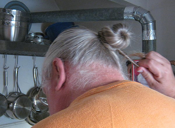 Continue on with the gathering, twisting, and coiling process, "ad nauseaum" (the stunning panoramic view in the background of my kitchen pots & pans are totally free-of-charge to longhairs, by the way)....