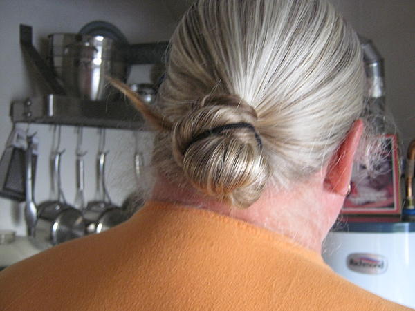 ....And here's what the end result looks like (as seen from a good angle underneath, to show the doubling of the hair-tie holding the bun well in place)... I hope you enjoyed this little "educational moment!" (LOL)