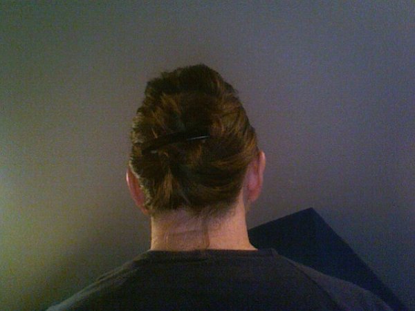SO. I bought a big barrette, twisted it up in the back and viola. Hair is up and out of my face, and feels great. No pulling. So easy.