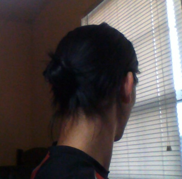 Of course, the front half of my hair still doesn't quite reach it. For this, I took the regular ponytail and tried to spread it around so that some part of it was facing every direction outwards (the middle being as close to right-on as possible. The longer hairs there can cover up the short ones by wrapping over it sometimes)