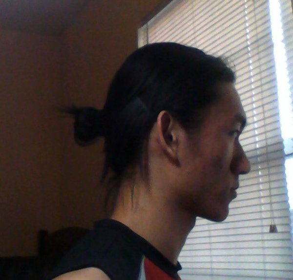 And it is here, on the day before the 9 month marker of my journey from a faux-hawk to long hair, that I have discovered that I can pull off that foldover-"bun" thing in the back.