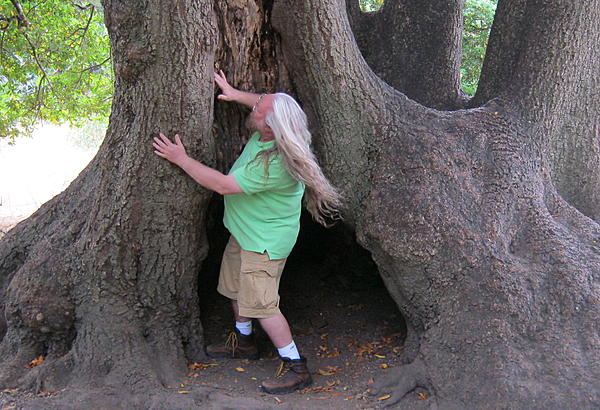 The tree photographed at the bottom of my Hair Page (where I'm hanging from a branch), now more than 10 years later, blew down during a storm and died a few years ago. Here I am climbing around on what's left of it, with Jason, Bill, and Larry probably wondering what the heck I'm trying to accomplish there.