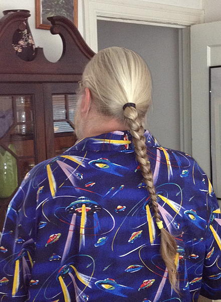 Here's a pic of a braid that my partner did for me a year or 2 ago, right before I went out to attend a big C&W dance event -- that "outer space" shirt, by the way, even though not very "Western", was hand-made by a friend of mine.