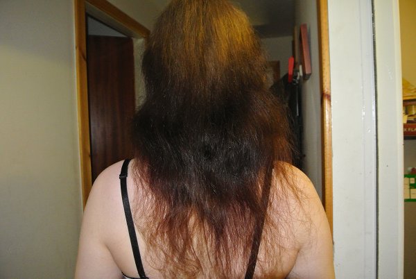 The impression I get is that you have grown your hair like I did, without any trims. I'm not suggesting trimming, but the back hair will be thinner than the rest because the rest hasn't caught up. What's your growth rate like?