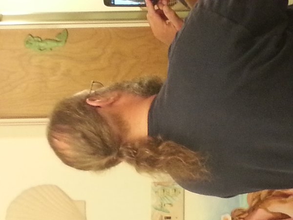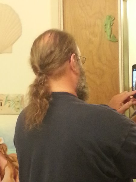 This is the first time I remember seeing your hair tied back into a tail -- looks GREAT!! Nice length, good color, and the natural waviness only adds even more dimension to it... Please don't ever consider cutting it, you have a really nice-looking head of hair -- it's a keeper!