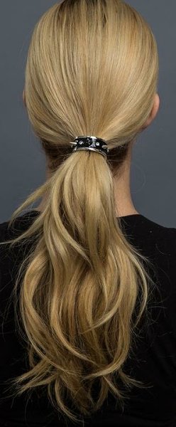 This one looks cool with spikes and rhinestones on a black cuff in the attached photo and has a clip on the back that fits over any ponytail elastic which I like because those elastics break every couple weeks if used everyday (which I don't plan on doing again).