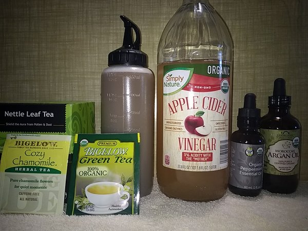 Well for over a month now I've been using things out of the kitchen cupboard for all my hair care. Get this, u can use a lot of the stuff u drink to wash your hair and it won't strip your hair of the natural oils that your hair needs like store bought shampoo. I took a picture of most of the things I use. Herbal teas can be used all the time as a rinse and supposedly speed up hair growth-chamomile tea is said to do that. Nettle is another herbal tea with no caffeine. I make the teas ahead of time and keep them in the fridge. Green tea can be used once or twice a week as it has caffeine (great for the scalp) but using it too frequently may dry out your hair. Concentrate the teas by 2X (1 cup is 2 tea bags).