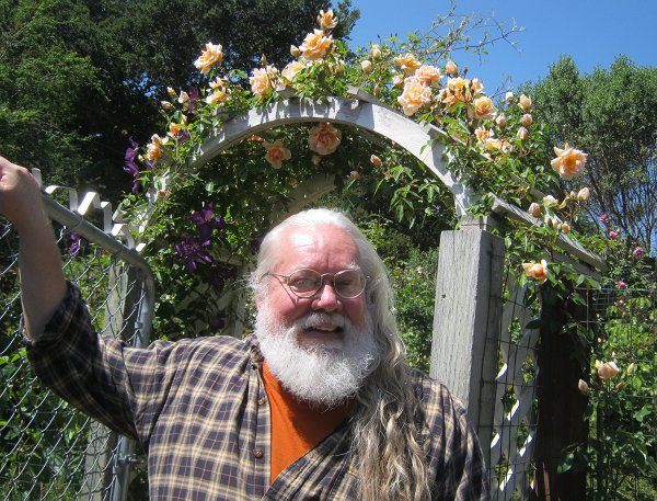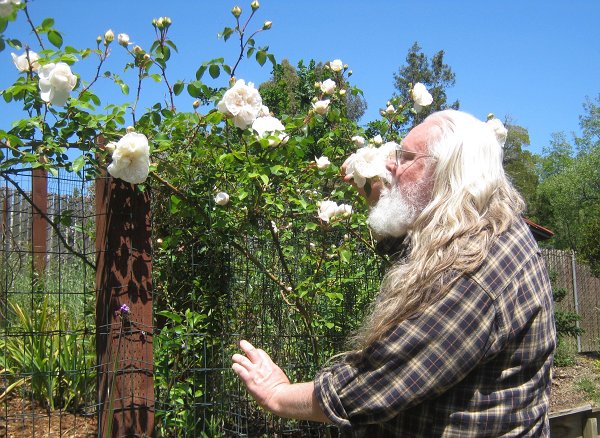 These pics of me outside of my deer fenced rose garden that I take care of at work were taken in May of 2014, I think... My friend Bill Choisser was still alive at the time, and it was a gorgeous spring day when he and his partner Larry visited me where I work (in San Francisco's suburban East Bay town of Castro Valley).