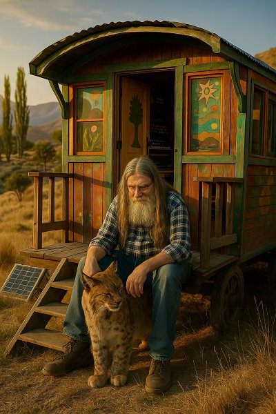 ...and now to the imaginative side: me and Tristan, my companion lynx, in front of our gypsy wagon somewhere in the Af... er, Berghani countryside! Made with ChatGPT image generator...